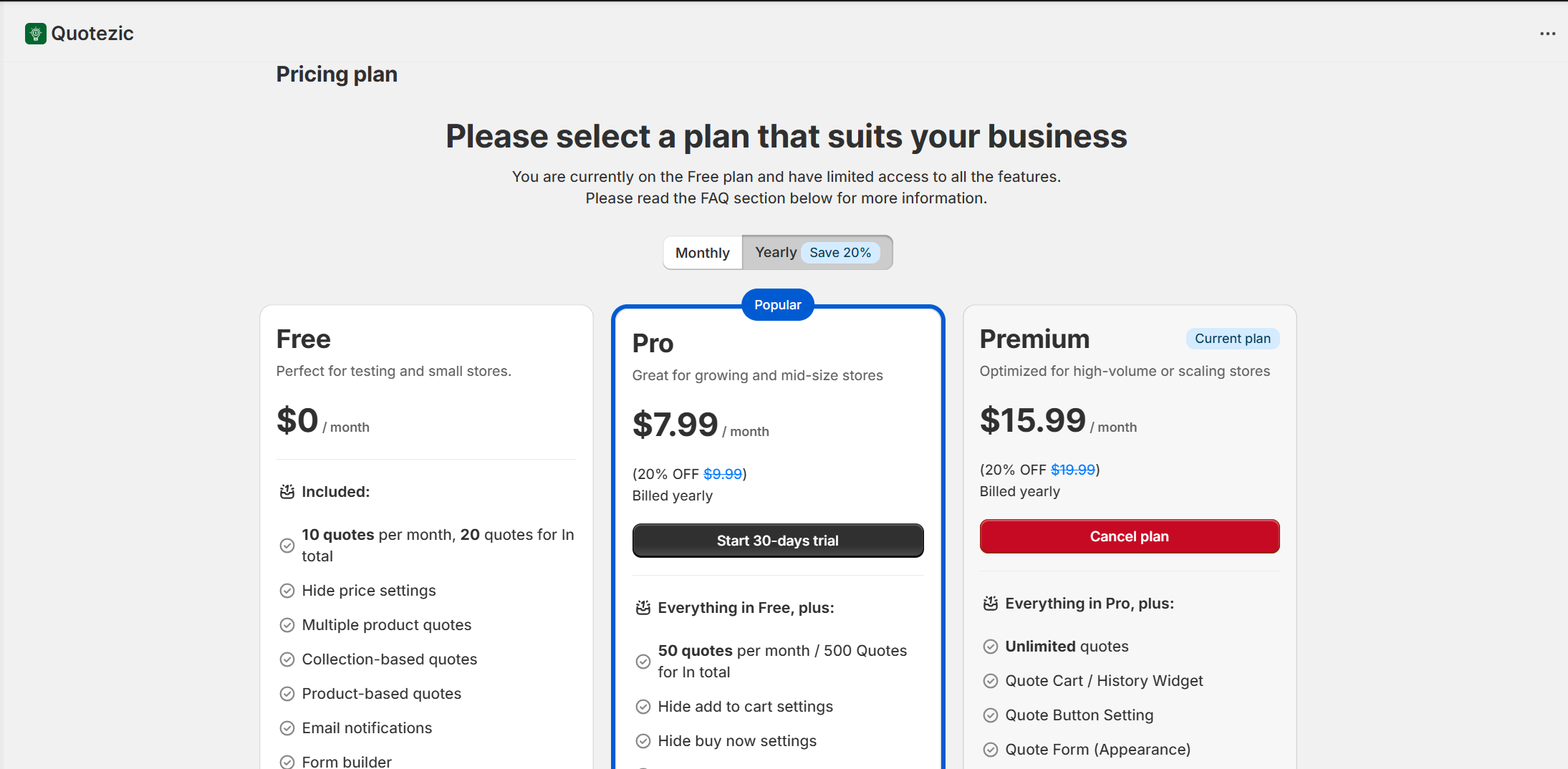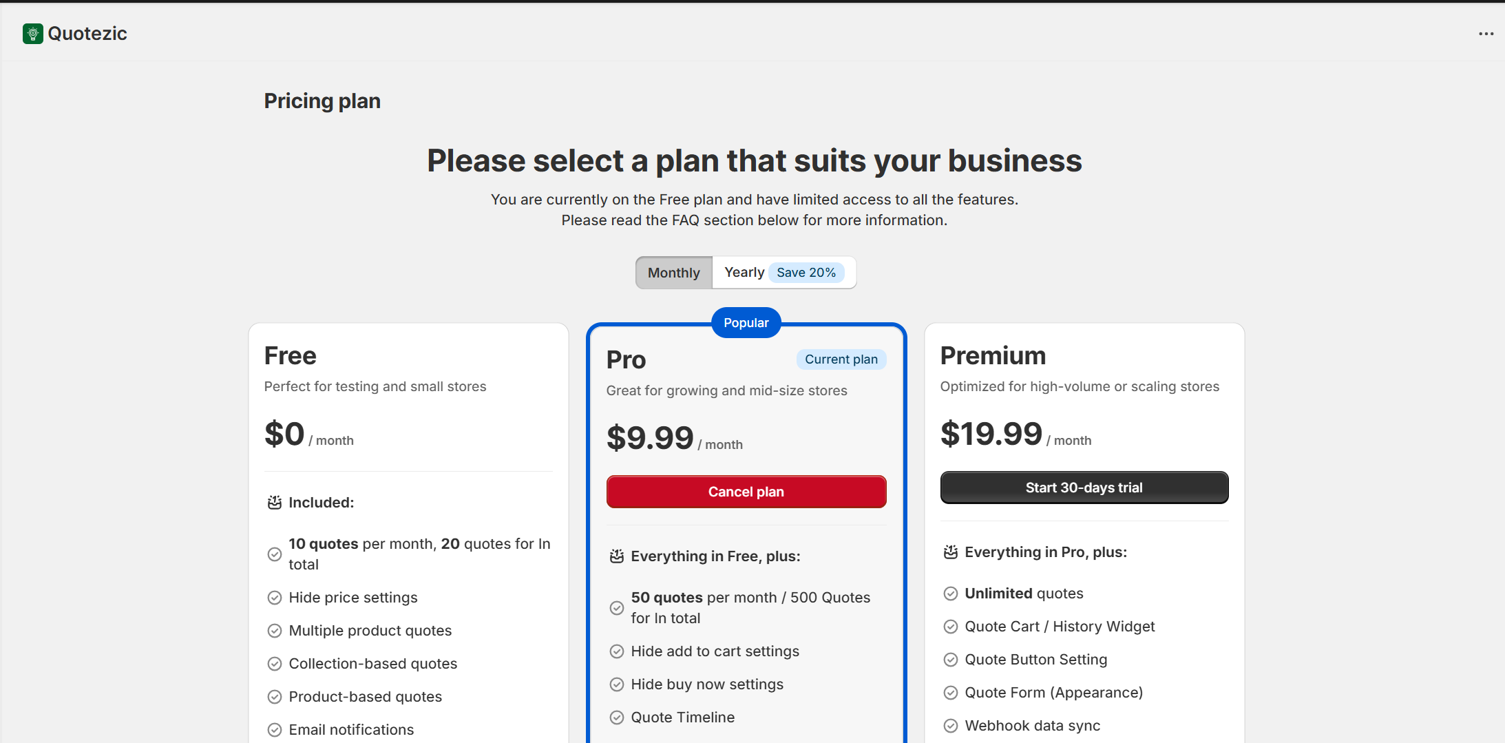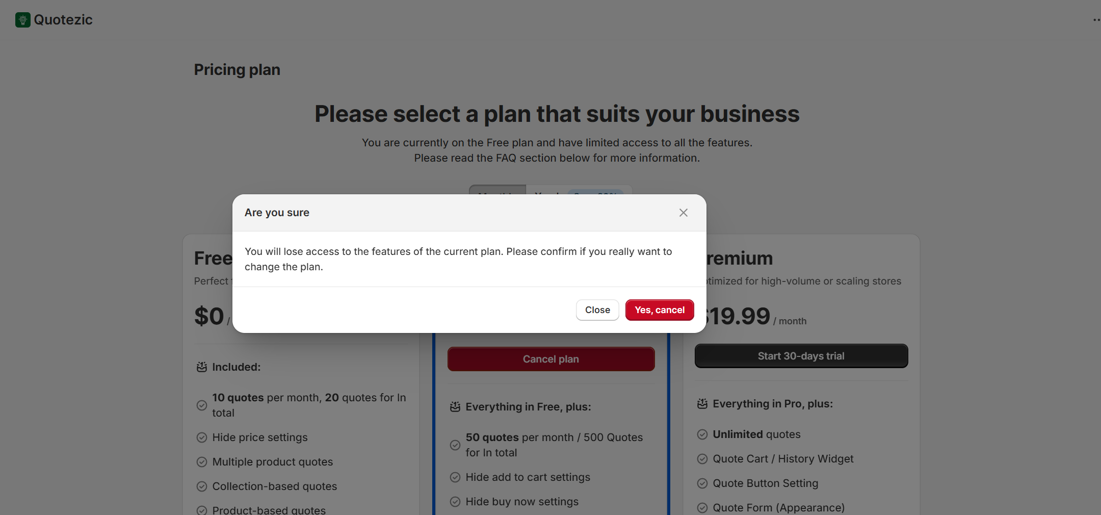 Quotezic allows you to easily upgrade, downgrade, or cancel your subscription based on your store’s needs. All subscriptions are billed directly through Shopify.