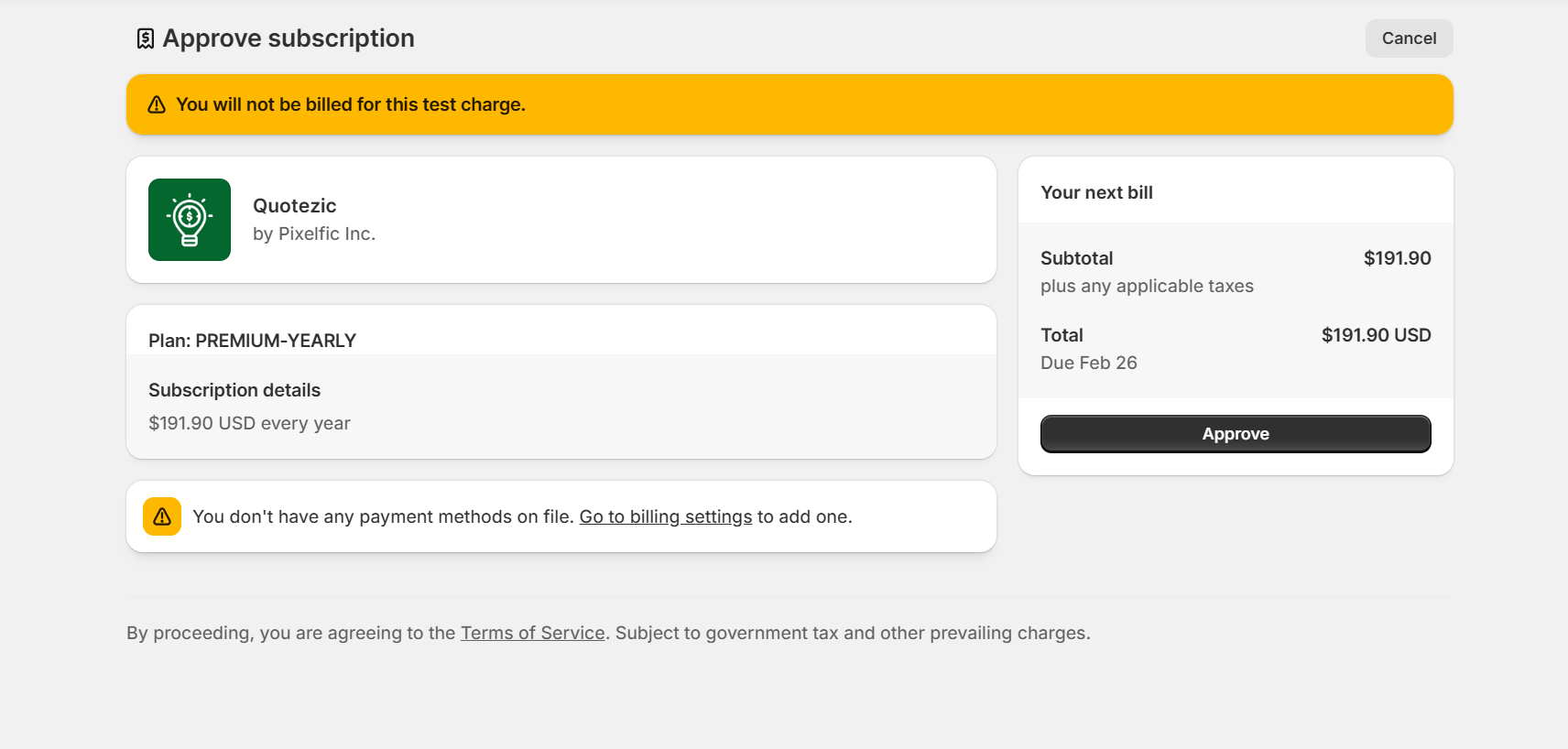 Quotezic subscriptions are billed at the store level via Shopify.